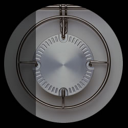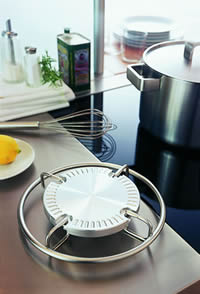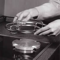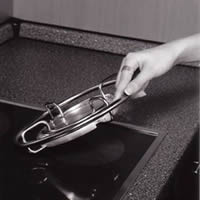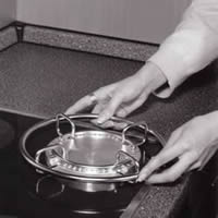 Der umlaufende Griffring des Gestells bildet gleichzeitig einen Schutzschild für die heiße Stirnkante der Wärmespeicherplatte gegen versehentliches Berühren. Da er die Stellfläche überragt, ist es möglich, auch größere Töpfe, Teller, Servierplatten o.ä. auf dem Gerät abzustellen.