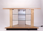 Hierbei handelt es sich um einen Möbelbeschlag zum Verbinden von drei winklig zueinander stehenden Möbelplatten (Boden, Seitenwand, Rückwand) mit zwei gleichen winkligen Beschlagsteilen. Die Stege des Winkels sind mit je einer Durchgangsbohrung versehen. Die Möbelplatten werden an ihren Flachseiten vorgebohrt (Glasscheiben werden mit Durchgangsbohrungen versehen) und mit handelsüblichen Befestigungsschrauben mit den Verbindern verschraubt. Durch die gelenkige Verbindung der Beschlagsteile untereinander können Möbelplatten zu dem in einem flexiblen Winkel zueinander montiert werden.
